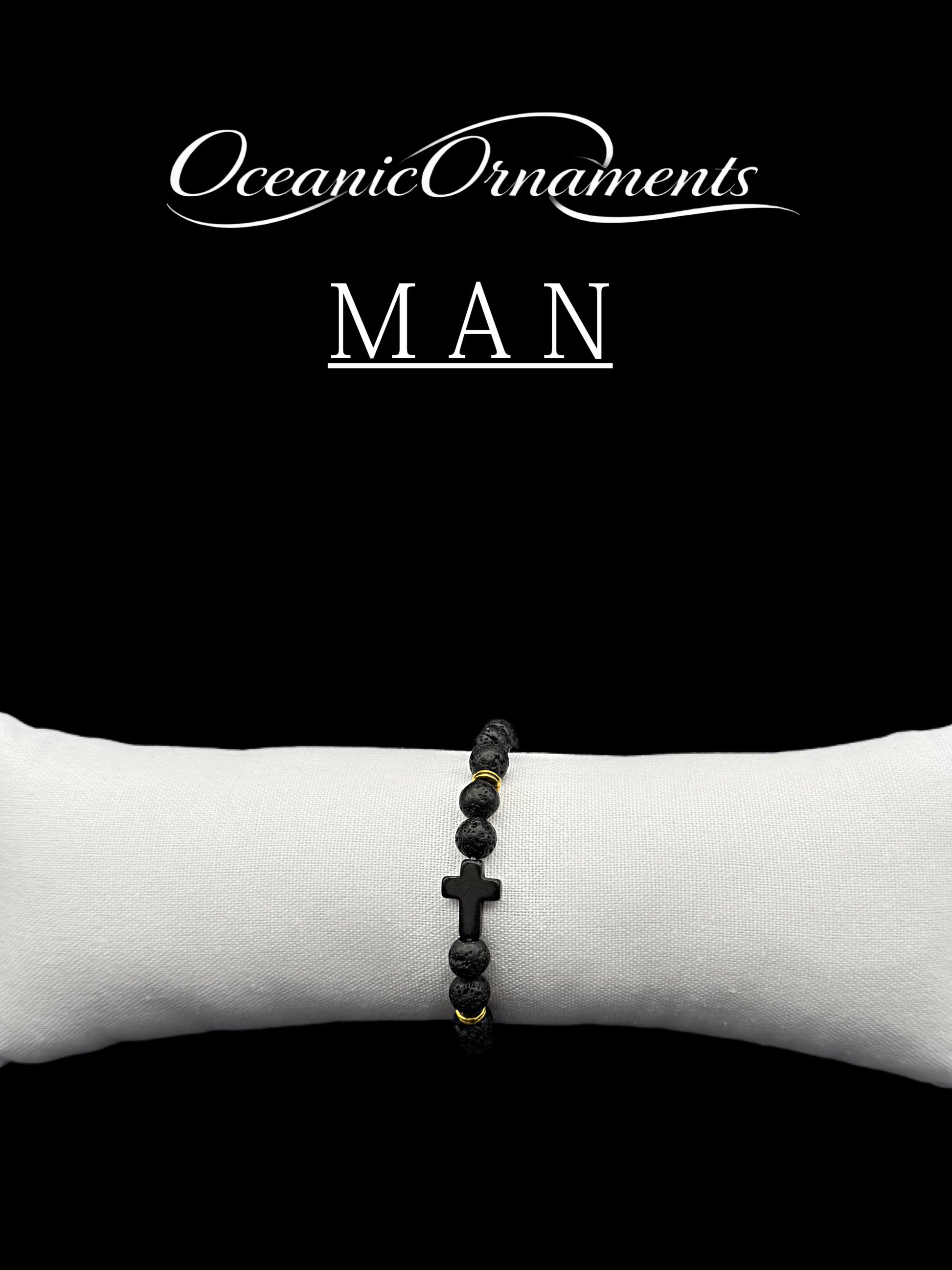Die strukturierten Lavasteine erinnern an erstarrte vulkanische Energie – kraftvoll, rau und natürlich. In der Mitte setzt das schwarze Kreuz ein klares Symbol für Ruhe, Glauben und Beständigkeit. Dezente goldene Elemente verleihen dem Armband eine edle Note und schaffen einen stilvollen Kontrast zur dunklen Oberfläche des Steins.