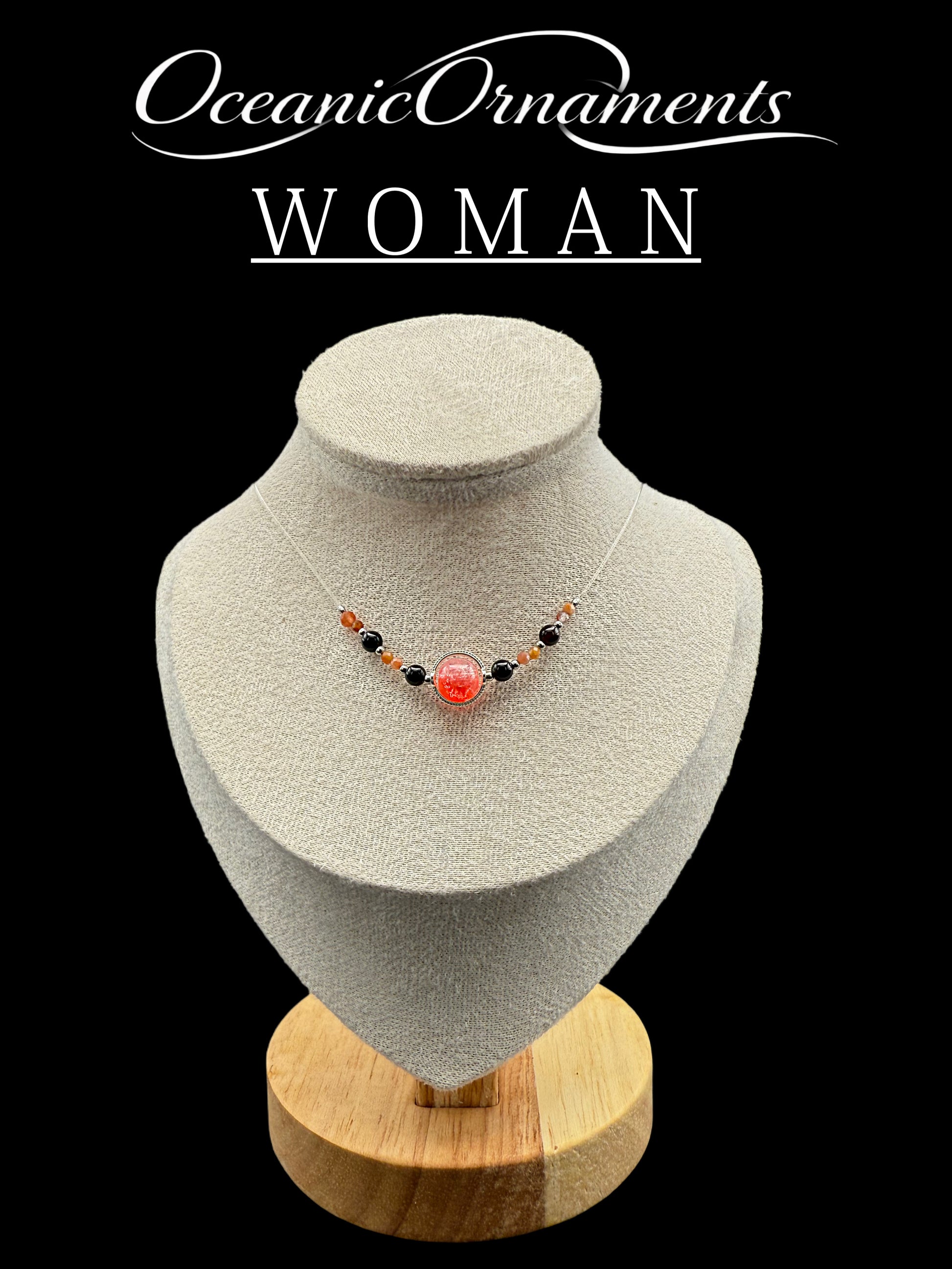 Die Halskette „Fire Pulse“ verbindet kraftvolle Kontraste mit einem modernen, ausdrucksstarken Design. Tiefes Schwarz trifft auf warme Orangetöne und erzeugt ein Schmuckstück mit besonderer Energie.