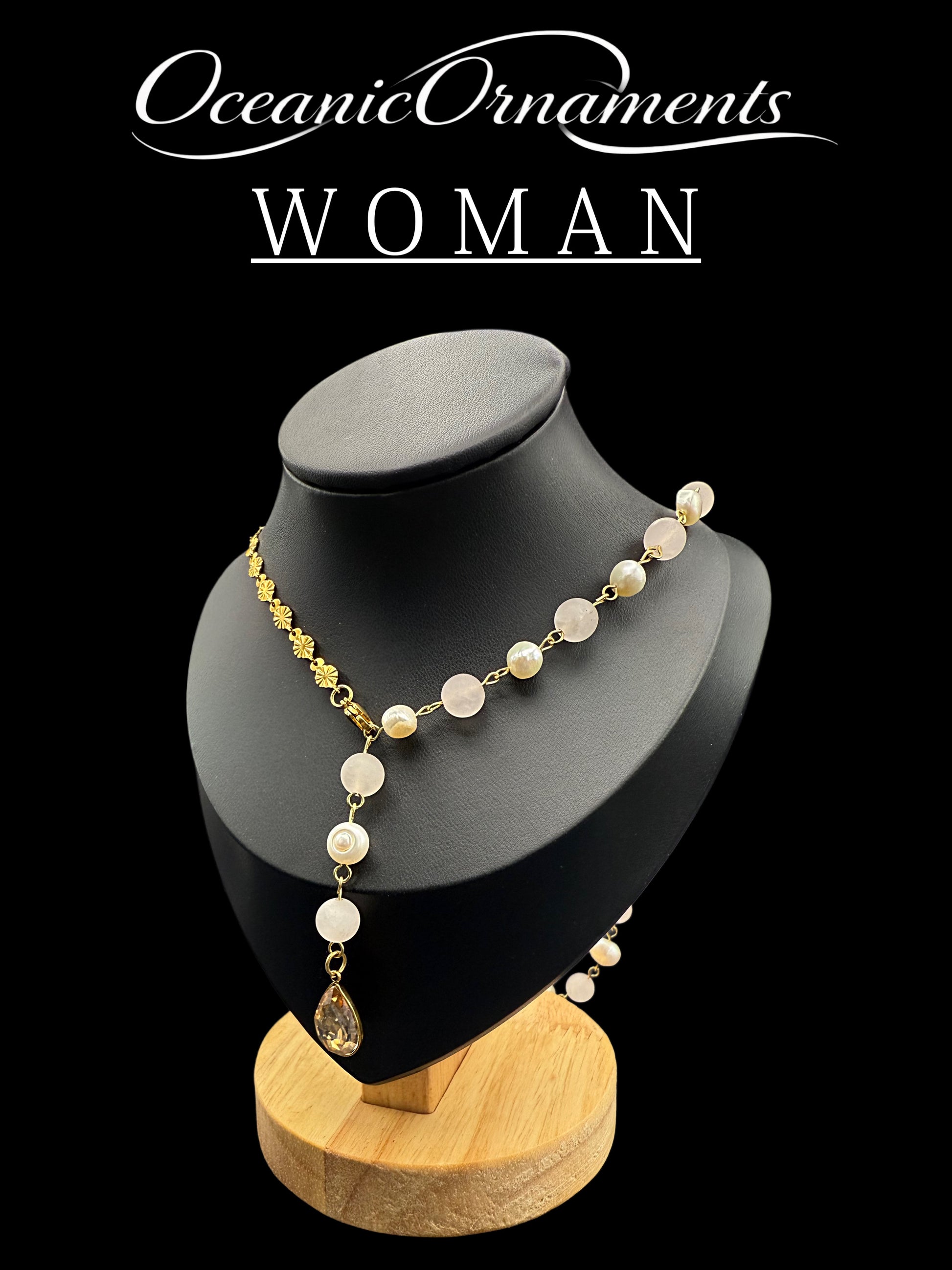 - Materialien: Rosenquarz matt gefrostet (8 mm), Süßwasserperle, Edelstahlkette